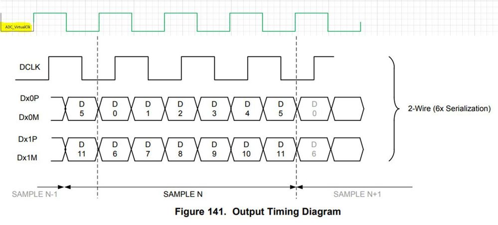 I'm trying to use DDIO to capture ADC LVDS data from ADC3224. The device is set at 2 wires(x6) mode. The FPGA is Arria10(10AX027) and running at 100MHz sampling rate, which makes the ADC_FCLK and ADC_DCLK equal to 100 and 300MHz.