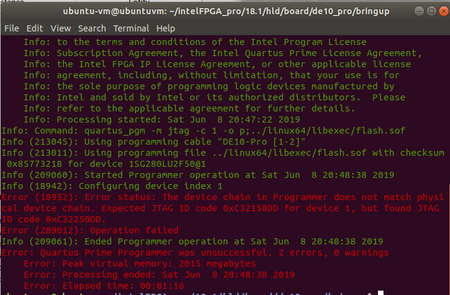 The documentation says to load the *.sof file by calling script in BSP ("./bringing_up fpga"). But I am receiving this error Error (18952): Error status: The device chain in Programmer does not mat...
