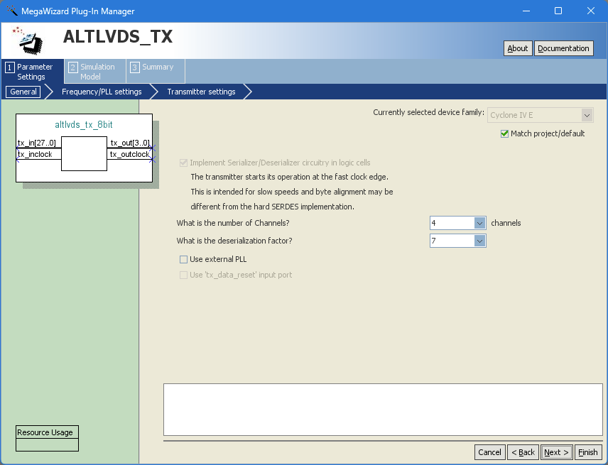 - PLL c0 output is 252 MHz, this feeds the tx_inclock port of both alt_lvds_tx blocks