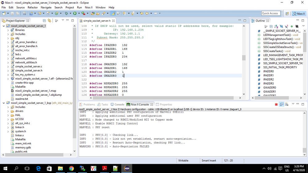 I was able to setup everything and start downloading the Nios II software project to the board. But while doing so, I am facing this auto negotiation failed warning. i am unable to decide whether the connection to the board was established or not. I have disabled the DHCP and given the address 192.168.1.234 in the simple_socket_server.h file. I have been following the steps mentioned in the document : https://www.intel.com/content/dam/www/programmable/us/en/pdfs/literature/tt/tt_nios2_tcpip.pdf