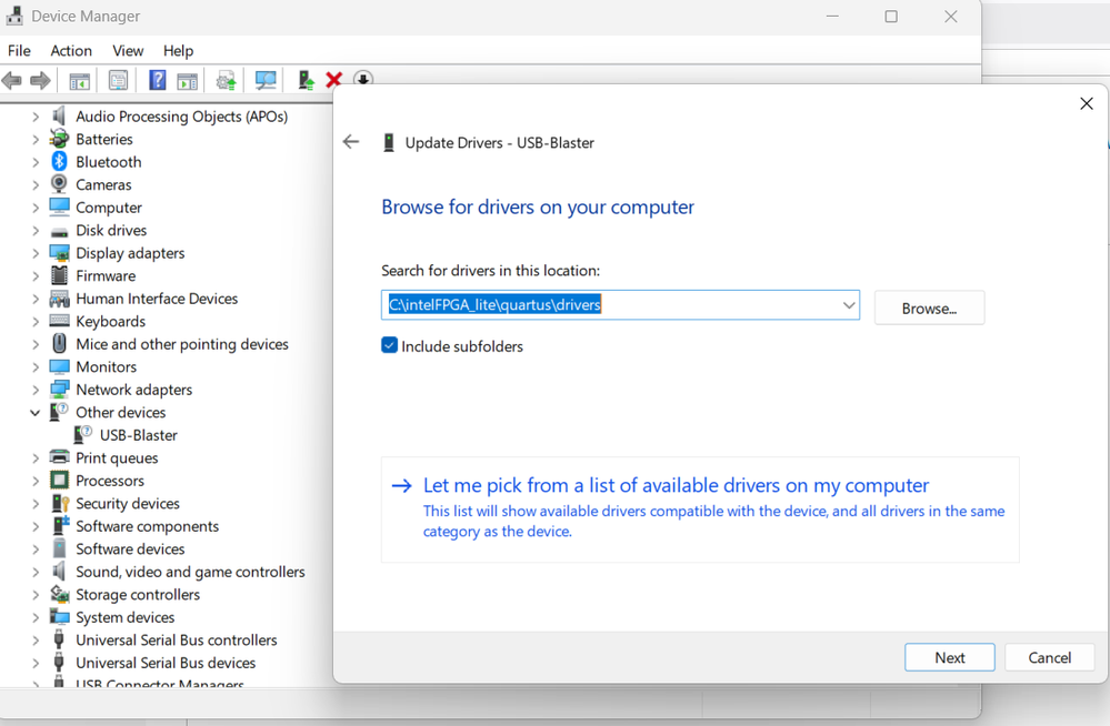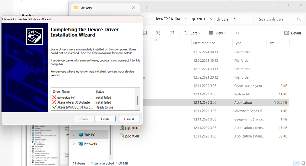 Hello! For the past few months i've been using a waveshare usb blaster v2 (i believe it's usb blaster II). It's been pretty reliable, working on all FPGAs (i use altera cyclone IV, ep4ce6 board) that whole time, but recently it stopped displaying in quartus prime as a jtag device. I looked in device manager and it showed that no driver was installed, so, following the tutorials, i selected update driver from quartus/drivers and got an error.
