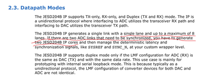 If the device clk and sysref of the two ADCs from a same clock chip, and I configure L M F = 2 8 8 for each ADC, I need to instantiate two ip cores and configure L M F= 2 8 8. Why cannot I instantiat...