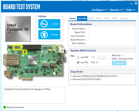 So my Cyclone 10 GX development board seems to run out of the box but the BTS doesn't reconfigure it. Everything seems to proceed but it always seem to configure as the Simple Socket Server (see scre...