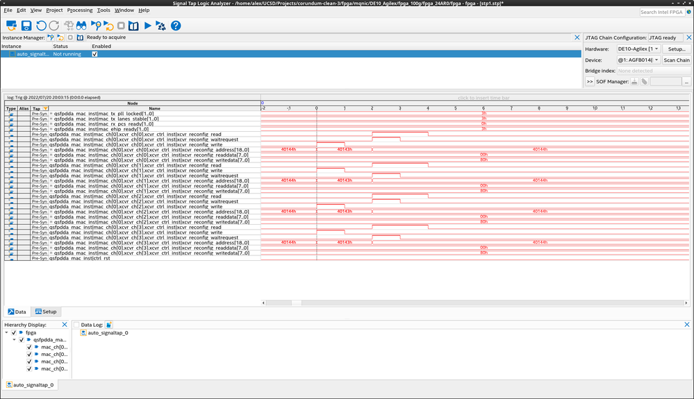 I am having trouble getting the RX side of the link working with the E-Tile in 100G mode on an Agilex F 014 part (DE10-Agilex board). I previously had a similar issue with the E-Tile in 10G and 25G mode, and was directed to manually trigger the PMA configuration load following the E-Tile PHY user guide (https://community.intel.com/t5/FPGA-SoC-And-CPLD-Boards-And/E-tile-automatic-adaptation-issues/m-p/1279308#M19854). Unfortunately, this same technique doesn't seem to work for the core in 100G mode.