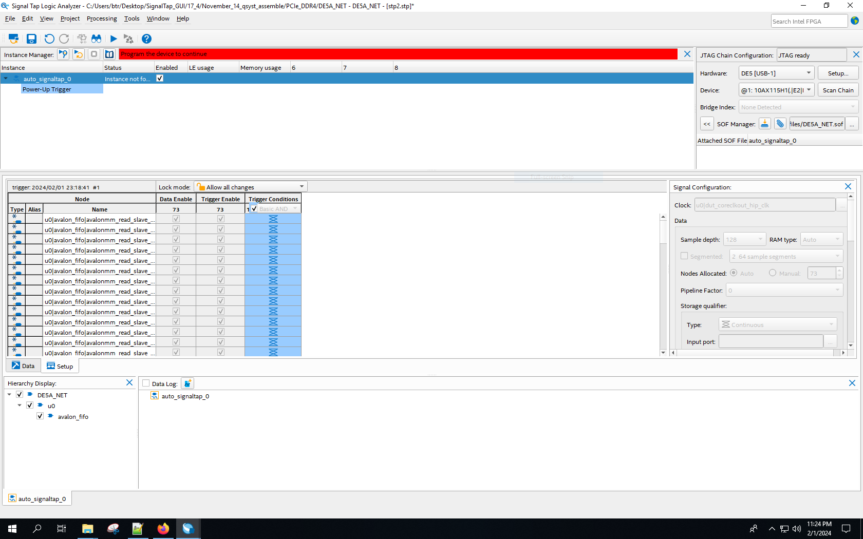 As an initial step (to test the working of the FIFO + PCIE DMA transfer example design, as our final aim is to get the data from QSFP+ to FIFO to goto the DDR4 element), we used a custom IP of data counter that counts upto 1000 (works on getting an trigger from a switch SW[0] ) to connect to Avalon FIFO IP. Then this design is integrated to the PCIe DMA transfer example design using Platform Builder. The idea is to stream created at the counter though FIFO to the DDR4 memory element. Then DMA read though PCIE to a host computer. But when we try to do DMA read from the host computer, we could not see the counter outputs (which we are suppose to get?).