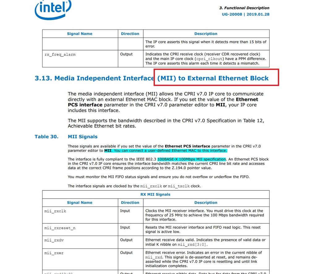CPRI DATA Path has been verified OK, and the next step we wantsto verify is cpri "C&M" Path, which according to Intel CPRi IP user guide, we could use 【 Media Independent Interface (MII)