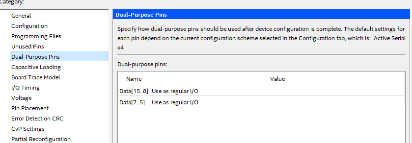 I see only the Data[15...8] and Data[7...0] in the "dual purpose pins" tab :