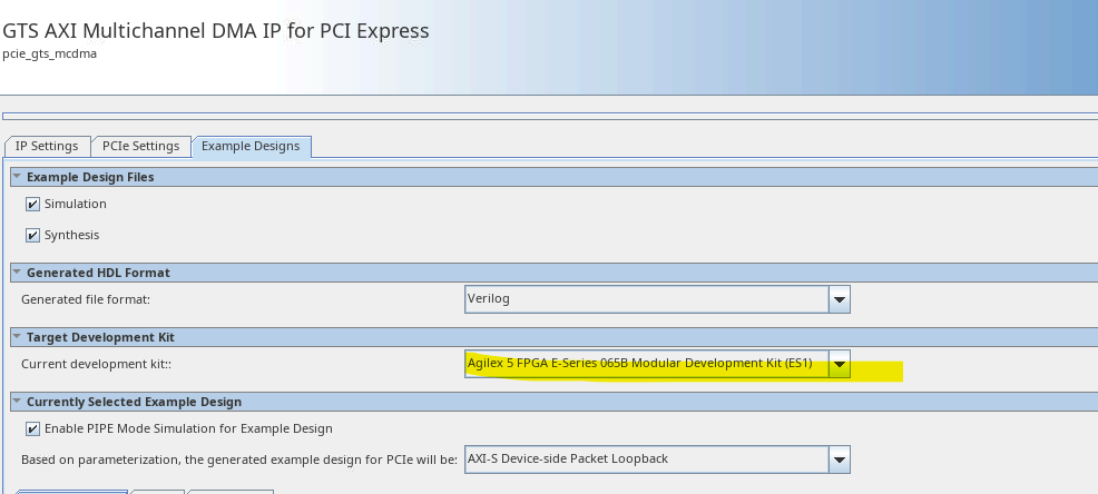 >> I believe it is default setting if I select the "current development kit" in IP GUI during Design Example Generation