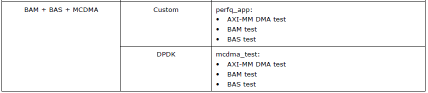 See Table 57 in the user guide for the application and supported test: https://docs.altera.com/r/docs/817911/25.3.1/axi-multichannel-dma-ip-for-pci-express-user-guide/design-example-overview