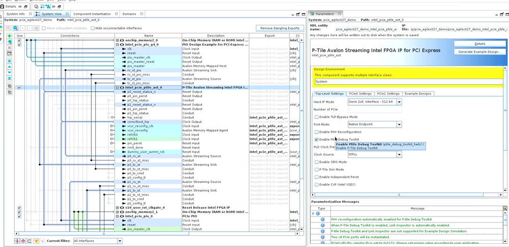 Regarding another issue: I am working with a custom-designed FPGA board using the AGFB027R25A2E2V chip. I have successfully implemented and run the PIO example project for intel_pcie_ptile_ast_0 Gen4 x16. However, when attempting to configure a 2x8 PIO setup, I encounter an issue where only one link is recognized by the system. Within the Quartus tool, I have been unable to locate a dedicated example project for a PIO 2x8 configuration. My initial attempt resulted in failure (the tool generated an x16 configuration instead). Would it be possible for you to share a reference example project for the 2x8 PIO implementation?