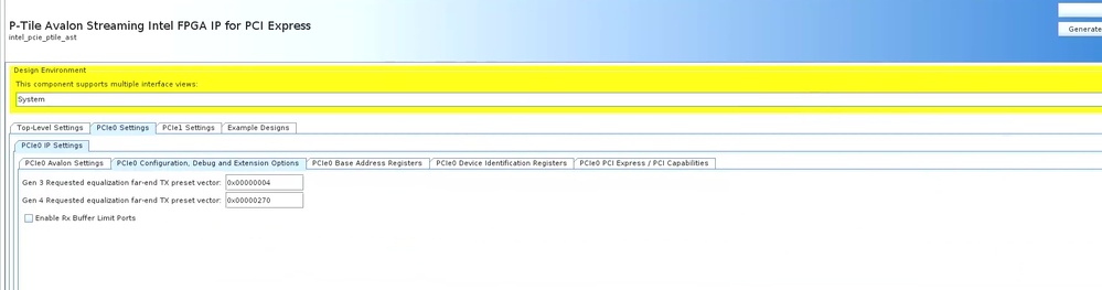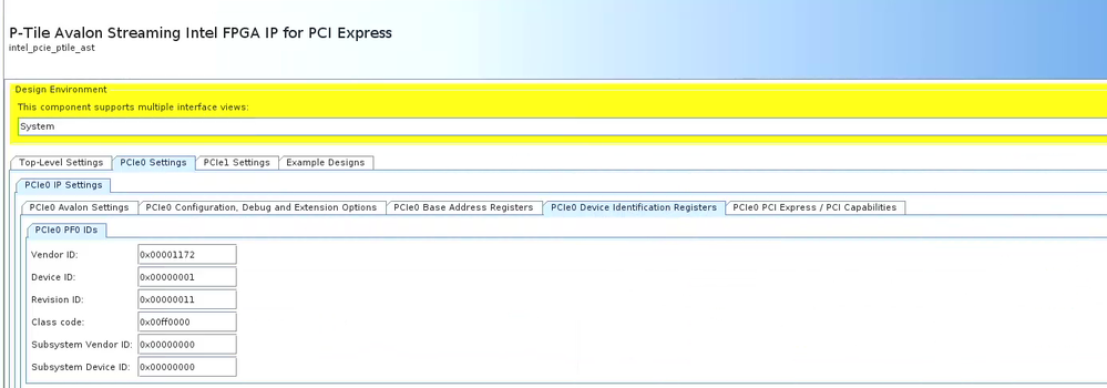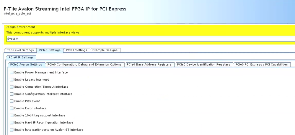 This design example only supports the default settings in the Parameter Editor of the P-tile Avalon Streaming IP for PCI Express. Therefore, leave all parameters at their defaults and modify only: