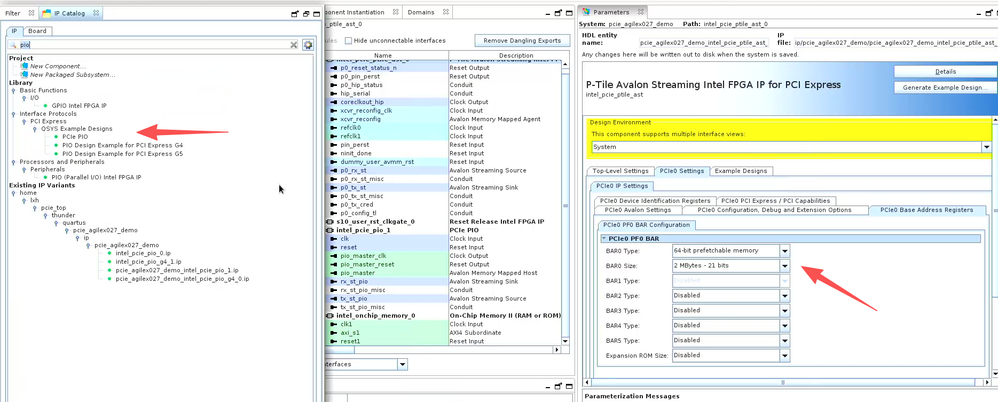 I am using the PIO example design of the P-Tile AVST PCIe IP on Intel Agilex 7. The original design maps a 16KB RAM to BAR0. Since my design requires a larger address space, I modified the PCIe IP's BAR configuration to increase BAR0 size to 2MB. However, I soon discovered that in the "PIO Design Example for PCI Express Gen4," the module converting AVST to AVMM only supports a 16KB address space after conversion. I then replaced it with the "PCIe PIO" IP core, but found that it can only access a 1MB region. What should I do?
