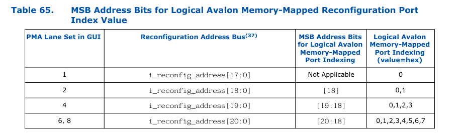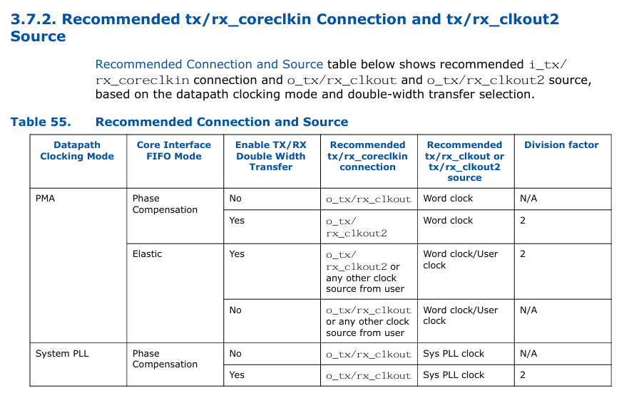 I am using PMA clocking, with a Phase Compensation FIFO and 2x Width transfer, which implies the use of o_tx/rx_clkout2, the Word clock and a 2x division factor. Table 61 also suggests we do not need custom cadence gen.