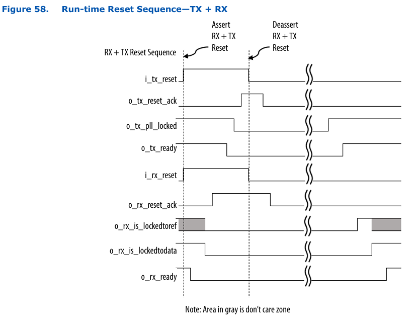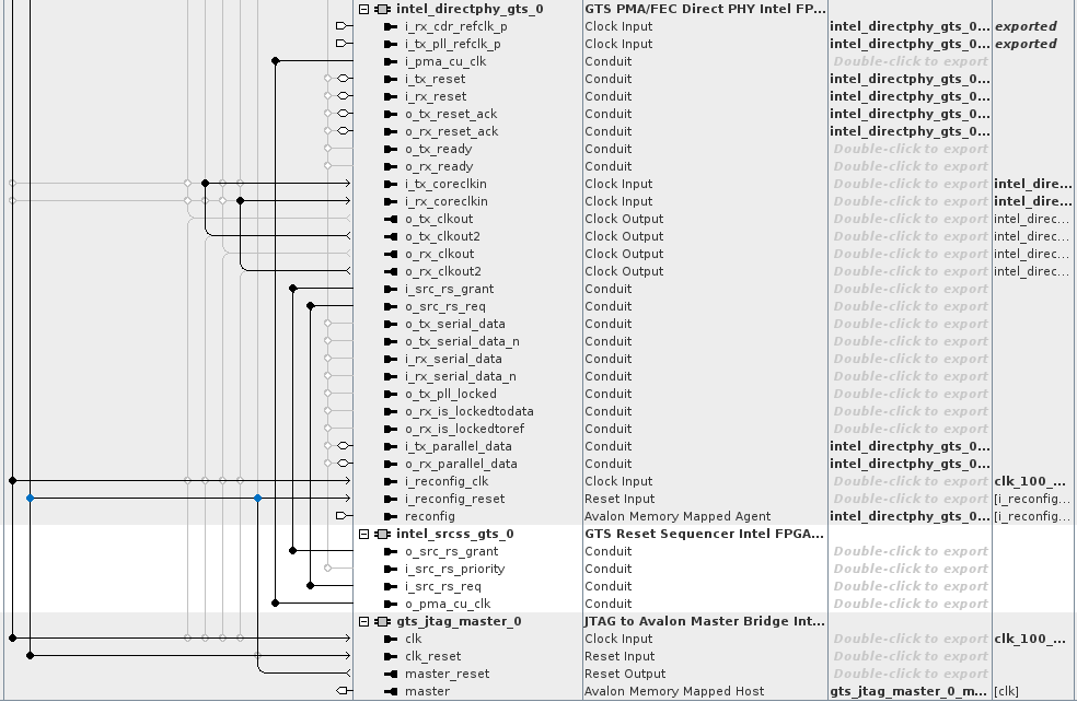 module golden_top(...); ... // GTS signals reg gts_i_tx_reset, gts_i_rx_reset; wire gts_o_tx_reset_ack, gts_o_rx_reset_ack; wire gts_o_tx_clkout, gts_o_rx_clkout; wire [79:0] gts_i_tx_parallel_data; wire [79:0] gts_o_rx_parallel_data; // jtag bridge wire write_bridge, read_bridge; wire [31:0] address_bridge; wire [31:0] writedata_bridge; wire [31:0] readdata_bridge; wire [3:0] byteenable_bridge; wire waitrequest_bridge; wire readdatavalid_bridge; // reset always @(posedge system_clk_100) begin if (system_reset) begin gts_i_tx_reset <= 1'b1; gts_i_rx_reset <= 1'b1; end else begin if((gts_o_tx_reset_ack==1'b1) && (gts_o_rx_reset_ack==1'b1)) begin gts_i_tx_reset <= 1'b0; gts_i_rx_reset <= 1'b0; end end end qsys_top soc_inst ( ... .intel_directphy_gts_0_i_rx_cdr_refclk_p_clk (REFCLK), .intel_directphy_gts_0_i_tx_pll_refclk_p_clk (REFCLK), .intel_directphy_gts_0_i_tx_reset_tx_reset (gts_i_tx_reset), .intel_directphy_gts_0_i_rx_reset_rx_reset (gts_i_rx_reset), .intel_directphy_gts_0_o_tx_reset_ack_tx_reset_ack (gts_o_tx_reset_ack), .intel_directphy_gts_0_o_rx_reset_ack_rx_reset_ack (gts_o_rx_reset_ack), .intel_directphy_gts_0_i_tx_parallel_data_i_tx_parallel_data (gts_i_tx_parallel_data), .intel_directphy_gts_0_o_rx_parallel_data_o_rx_parallel_data (gts_o_rx_parallel_data), .intel_directphy_gts_0_reconfig_write (write_bridge), .intel_directphy_gts_0_reconfig_read (read_bridge), .intel_directphy_gts_0_reconfig_address (address_bridge[17:0]), .intel_directphy_gts_0_reconfig_byteenable (byteenable_bridge), .intel_directphy_gts_0_reconfig_writedata (writedata_bridge), .intel_directphy_gts_0_reconfig_readdata (readdata_bridge), .intel_directphy_gts_0_reconfig_waitrequest (waitrequest_bridge), .intel_directphy_gts_0_reconfig_readdatavalid (readdatavalid_bridge), .gts_jtag_master_0_master_address (address_bridge), .gts_jtag_master_0_master_readdata (readdata_bridge), .gts_jtag_master_0_master_read (read_bridge), .gts_jtag_master_0_master_write (write_bridge), .gts_jtag_master_0_master_writedata (writedata_bridge), .gts_jtag_master_0_master_waitrequest (waitrequest_bridge), .gts_jtag_master_0_master_readdatavalid (readdatavalid_bridge), .gts_jtag_master_0_master_byteenable (byteenable_bridge), ... ); ... endmodule