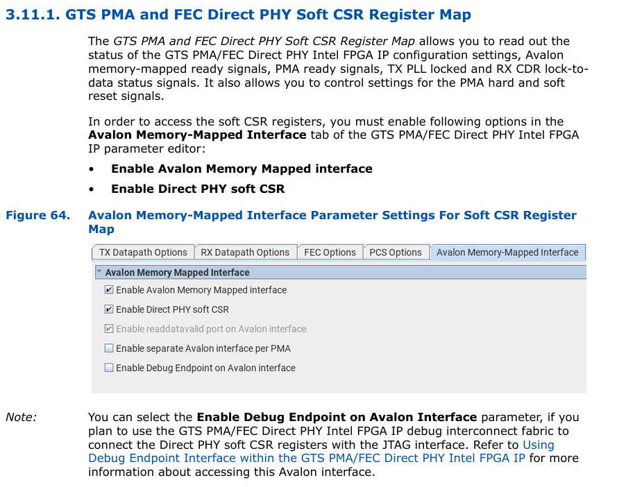 GTS PMA/FEC PHY settings changed from default: ------------------------------ Datapath clocking mode : PMA TX/RX PMA interface FIFO mode : Register TX/RX clock clock source : Word Clock Enable TX/RX_clkout2 port : YES TX/RX clkout_2 clock source : Word Clock TX/RX _clkout2 div by : 2 Enable Avalon Memory Mapped interface : YES Enable Direct PHY soft CSR : YES Enable Debug Ednpoint on Avalon interface : YES