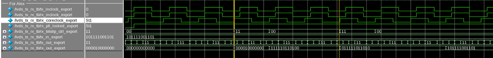 Here in ALTLVDS_Tx I have a fixed 12 bit value 0xBCD for test. In above waveform, we can see 0xBCD is decomposed into 2 serial data lane within a tx_outclock cycle.