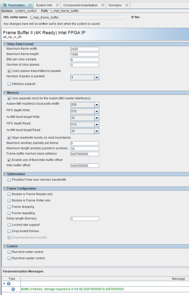 I am using the video frame buffer II IP in Arria 10 Platform and below is the configuration of the IP.
