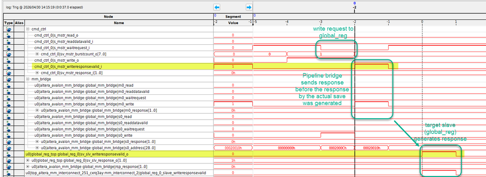 However, when I capture the transactions using Signaltap I noticed that the Bridge is creating a writerepsonse valid before, this is even processed by the addressed slave. In the signaltap capture, you can see the writereponse (highlighted in yellow) arriving at the initiating master (cmd_ctrl) before, the addressed slave (global_reg) even generates it. Hence I would assume this is generated by the mm_bridge directly after it accepts the write command.
