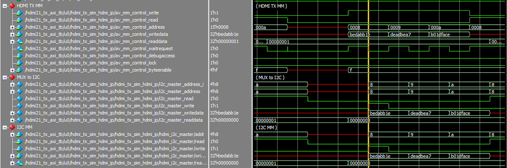HDMI IP 23.2-19.7.2, being configured as Source/TX with FRL support, AXI4S video interface (VVP Full), and I2C master, does not accept back-to-back writes to I2C master registers. The attached simulation waveform demonstrates that only one write strobe (Avalon MM write pulse) was passed through the DEMUX to the I2C master, while the external Avalon MM master performed three writes (to SCL_LOW, SCL_HIGH, and SDA_HOLD). Registers read back sequence confirms that only the first register in the write sequence, SCL_LOW, is modified.
