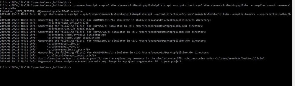 Hi, Msim_setup.tcl run, followed instructions. Is …<directory> necessarily directory with top level entity? Do the ip generated files I have (IPpll.v, IPpll_inst.v, and IPpll_0002.v) have to be in project folder or just IPpll.qip? Without invoking ModelSim from Quartus, how doe a woek directory get populated? Len- AnandRaj_S_Intel