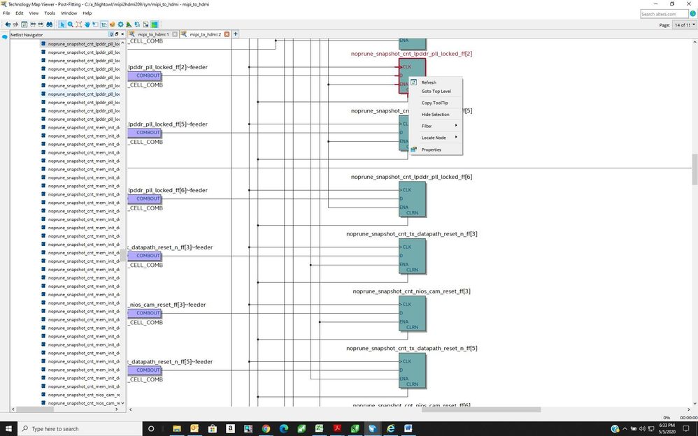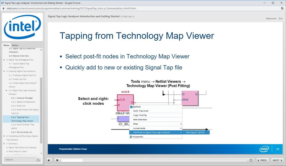 Thanks for your assistance. Indeed the tutorial does say the Technology Map Viewer(Post Fitting) and not the RTL Viewer as I originally said. I read Technology Map Viewer and remembered RTL Viewer. However, when I select a component in the Technology Viewer(Post Fitting) and right click on it there are only 7 choices available in the resulting selection box instead of 8 as shown in the tutorial, and the one that is missing is the "Add Node to Signal Tap Logic Analyzer" choice. See attached images of the Getting Started Tutorial and my Technology Viewer showing the choice box that pops up from a right click.