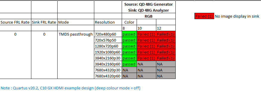 I'm using the Intel HDMI 2.0 RX IP on a Cyclone 10 GX, Quartus Prime Pro 20.2. I cannot get it to lock at any frequency. My video source is a Teledyne-Lecroy HDMI analyzer, so I feel comfortable that the video input is valid.