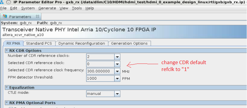 - Modify gxb_rx NativePHY IP to change default CDR refclk to 1 (refer to attached pic)