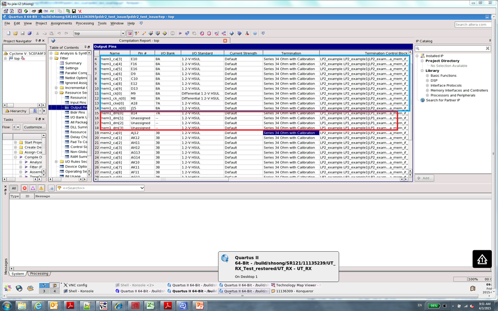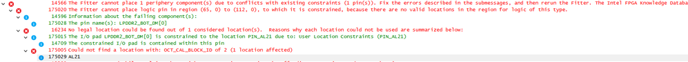 To verify if this is the issue, in the Compilation Report, go to Fitter -> Resource Section -> Output pins and scroll to the row with the mem_* signal. Scroll to the right and verify which OCT control block the pin is assigned to.