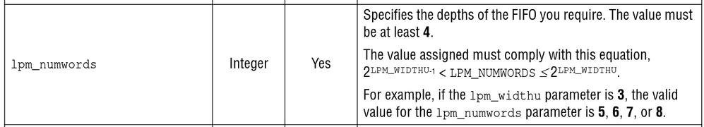 For lpm_numwords=32, I set lpm_widthu to be 6. Nevertheless for 32 depths, I get a compilation error telling me lpm_widthu has to be 5.
