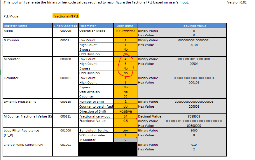 Download the calculator: https://www.intel.com/content/dam/www/programmable/us/en/others/literature/an/pll_reconfiguration_calculator.xlsx