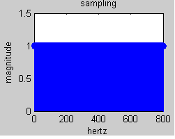 hi i have typed followin code to verify samplng theorem but the answer is coming something different.may i know the reason. clc; fs=800; t=0:1/fs:1 x=cos(2*pi*400*t); xm=(fft(x)); k=0:length(xm)-1; subplot(2,2,1); stem(k,xm) xlabel('hertz') ylabel('magnitude') title('sampling') the result should come at only one frequency(i.e one line at frequency of cosine) as the signal is cosine but spectrum is continious. why ? the spectrum (o/p)is attached here thanks in advance