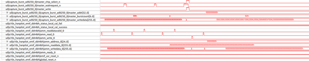 Also, there is no "chip_select" on the emif amm interface (see https://docplayer.net/88824953-External-memory-interfaces-intel-arria-10-fpga-ip-user-guide.html). However, if I don't assert chip_select during transaction from master to emif, it will not work ! Because of this, I'm not really sure how to exactly assert this chip_select signal since it is not visible anywhere on the EMIF, but it affects its behavior...