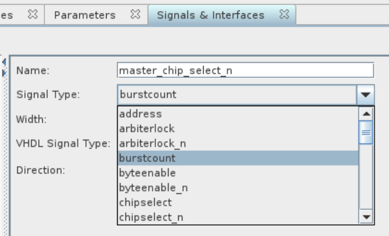 Moreover, I would like to add beginbursttransaction signal on my master , but in QSYS Component Editor -> Signals & Interfaces -> my "avalon_master" conduit end doesn't provide any signal of this kind.