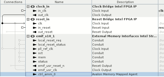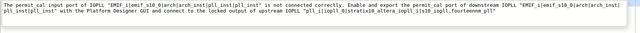Error(20181): The permit_cal input port of IOPLL "EMIF_i|emif_s10_0|arch|arch_inst|pll_inst|pll_inst" is not connected correctly. Enable and export the permit_cal port of downstream IOPLL "EMIF_i|emif_s10_0|arch|arch_inst|pll_inst|pll_inst" with the Platform Designer GUI and connect to the locked output of upstream IOPLL "pll_i|iopll_0|stratix10_altera_iopll_i|s10_iopll.fourteennm_pll"