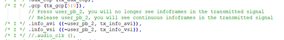 With that, the Infoframe packet will be sent out when info_avi[112]=0 (user_pb_2=1, released) and blocked/filtered out when info_avi[112]=1 (user_pb_2=0, pressed) .
