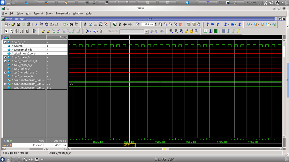 am using 18.1 quartus tool and IP name is "ESRAM" here am attaching the project files and the simulation waveform capture,while generating the IP core i configured the 'refclk' as 100Mhz and output clk as 500Mhz but when am trying to drive the reflck from the testbbench am able to get the refernce clk but am unable to generate the output core clk and lock signal , is there anything i have to drive from the testbench??