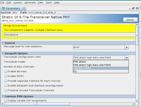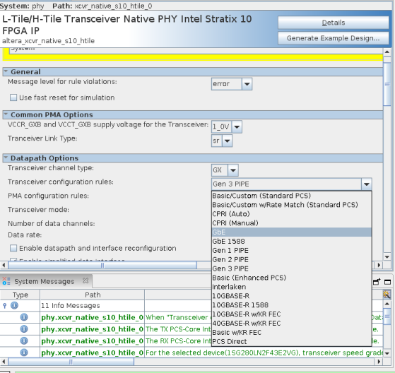 Now I changed the device (as per requirement) to stratix10 DX device which is E-tile P-tile. So here I can see the transceiver rule is limited to PMA i.e no pcs. So how can we integrate this phy with custom controller as standered is pipe interface for PCIe.