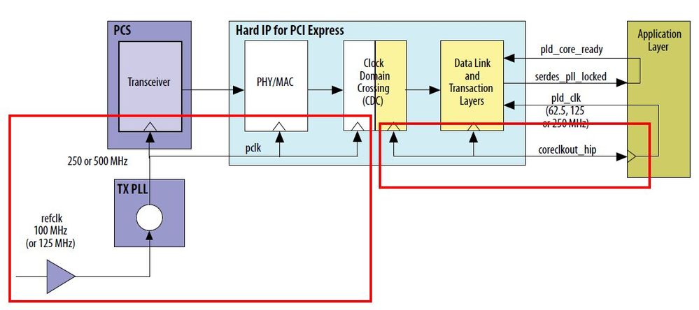 It looks like refclk and coreclkout_hip are not related. I realize this is just a block diagram, but if coreclkout_hip is not generated from refclk, how is it generated? I there a clock source in the PCIe hard IP?