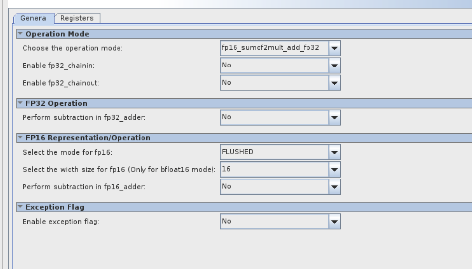 I selected Native Floating Point DSP and configured to "Sum of two FP16 multiplication with FP32 addition mode" using "fp16_mult_top_a*fp16_mult_top_b(16'b1) + fp16_mult_bot_a*fp16_mult_bot_b(16'b1) + fp32_adder_a".