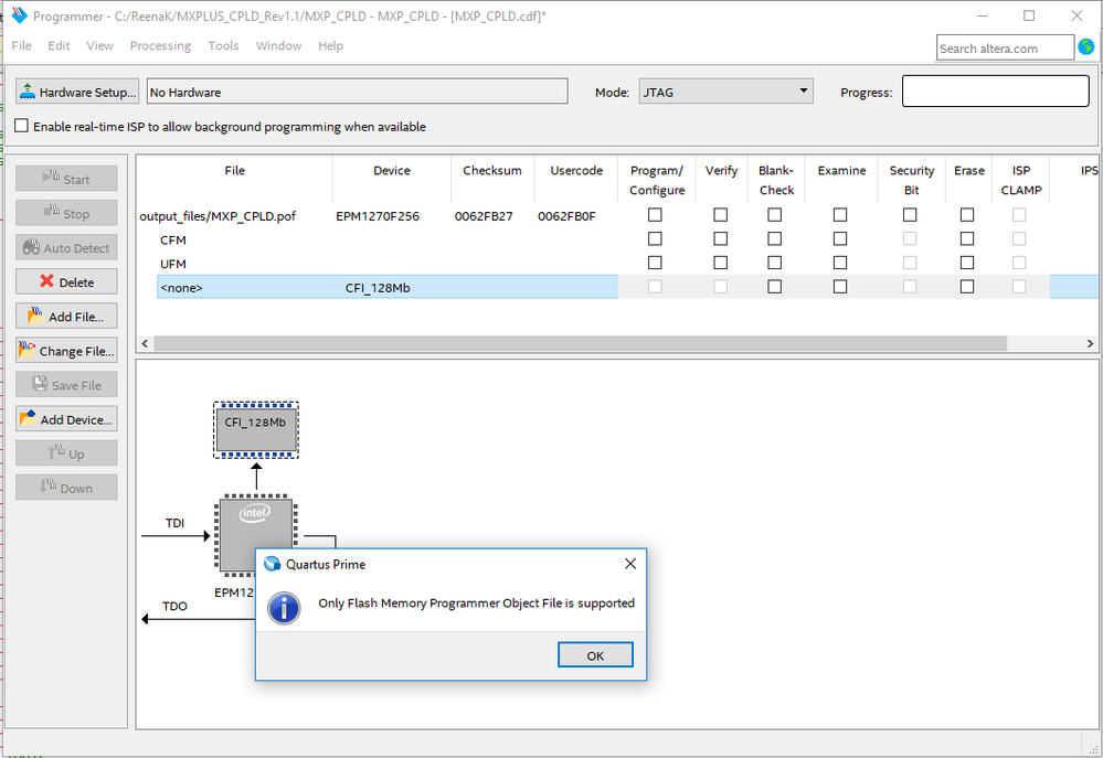 I am trying to implement PFL IP in my project. I am using a CPLD to configure FPGA using 128Mb flash . For this I first have the CPLD code compiled. This generated a CPLD.pof file. After this I instantiated the PFL IP and generated the QIP and SIP files. In Intel FPGA Parallel Flash Loader User Guide, it says Compile and generate a pof for the flash memory device. My question is how do I do this?