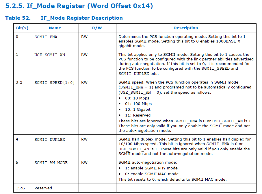 Even disabling auto-negotiation and setting the interface speed to 100Mbps (via the “IF_Mode Register” register, PCS offset 0x14) the speed does not seem to change in the status registers (via “PCS Control Register”, offset 0x00). Such behavior can be confirmed because the interface continues operating correctly at 1 Gbps.