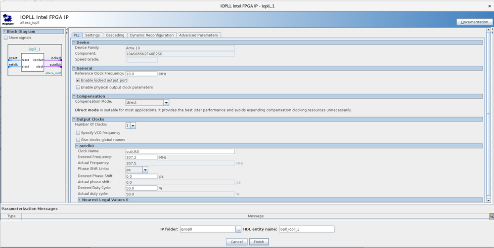 I have created one simple counter logic, to make sure fPLL works for user logic. I have attached parameter selction pic for fPLL.