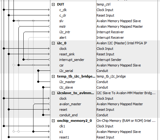 The Qsys subsystem under test includes the I2C Master IP Core, my custom VHDL component that interacts with it and the Intel I2C Slave IP Core together with a On-Chip RAM for test purposes. In hardware the I2C Slave and the RAM will be replaced by the temperature sensor.