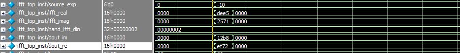 In another project, I used the following script command to compile the ifft file: 1. vlog -vlog01compat -work work +incdir+G:/trans_sim_tx/user/src/trans {G:/trans_sim_tx/user/src/trans/ifft_top.v} vlib ifft vmap ifft ifft 2. vlog -vlog01compat -work ifft +incdir+G:/trans_sim_tx/user/ip/trans/ifft/ifft/synthesis {G:/trans_sim_tx/user/ip/trans/ifft/ifft/synthesis/ifft.v} 3. vlog -sv -work ifft +incdir+G:/trans_sim_tx/user/ip/trans/ifft/ifft/synthesis/submodules {G:/trans_sim_tx/user/ip/trans/ifft/ifft/simulation/submodules/ifft_fft_ii_0 .vo} 4. vcom -93 -work ifft {G:/trans_sim_tx/user/ip/trans/ifft/ifft/synthesis/submodules/auk_dspip_math_pkg.vhd} 5. vcom -93 -work ifft {G:/trans_sim_tx/user/ip/trans/ifft/ifft/synthesis/submodules/auk_dspip_lib_pkg.vhd} The following simulation results appear