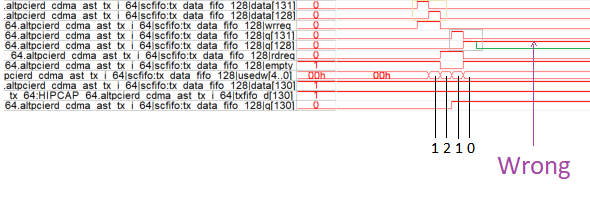 The tx_st_eop at the FIFO output should actually follow the green line and go back to low (like the input). However, it remains high (red line = wrong).