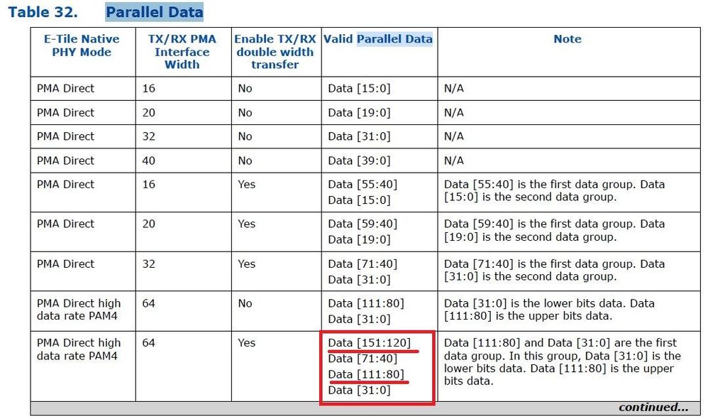 My design has a parallel data of 128-bit width, So I used the "Enable TX/RX double width transfer" option. I referred the 'E-Tile Transceiver PHY User Guide (UG-20056)' about the connectivity of parallel data using double width transfer. It seems that the TX/RX parallel data ports of the Transceiver are 80-bit wide, but the Table 32. in the user guide shows connectivity of 160-bit wide data. I've attached the snapshot for your reference.