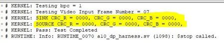 I found the same: # KERNEL: Testing Link HBR2 Rate Training Pattern 3 # KERNEL: TX Frequency Change Detected, Measured Frequency = 135 MHz # KERNEL: RX Frequency Change Detected, Measured Frequency = 135 MHz # KERNEL: End Testing Link HBR2 Rate # KERNEL: Testing bpc = 1 # KERNEL: Testing Video Input Frame Number = 07 # KERNEL: Testing Video Input Frame Number = 08 # KERNEL: Testing Video Input Frame Number = 09 # KERNEL: Testing Video Input Frame Number = 0a # KERNEL: Testing Video Input Frame Number = 0b # KERNEL: Testing Video Input Frame Number = 0c # KERNEL: SINK CRC_R = 9b40, CRC_G = 9b40, CRC_B = 9b40, # KERNEL: SOURCE CRC_R = 9b40, CRC_G = 9b40, CRC_B = 9b40, # KERNEL: Testing Video Input Frame Number = 0d # KERNEL: Pass: Test Completed Thank you for the help!