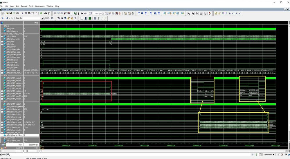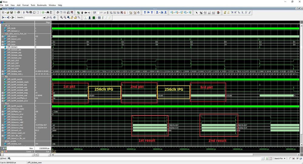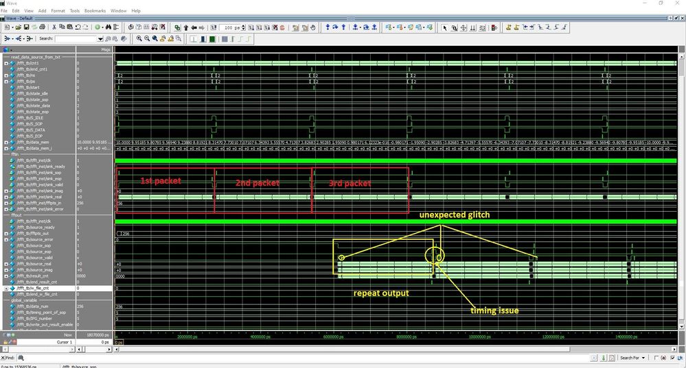 But If I choose same data source packet to input repeat continually, the FFT can output result repeat following each input packet, but all the FFT result output stated to have below common timing issue