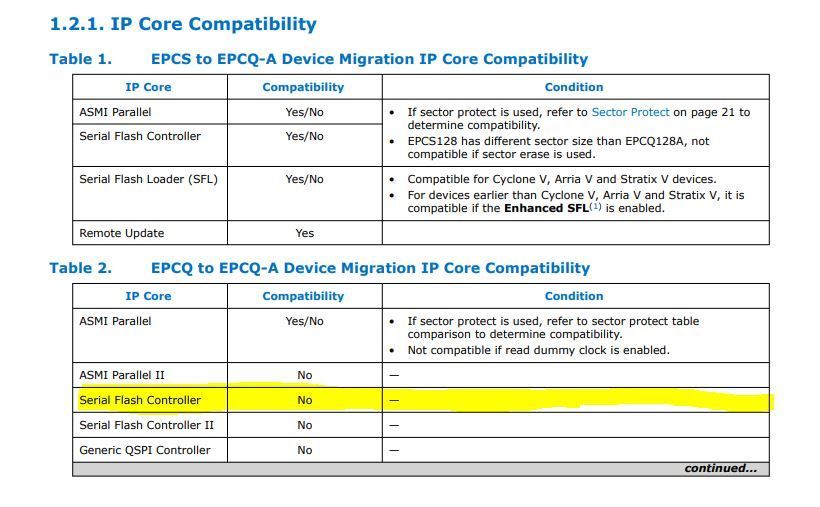 However, if you use a legacy device that is not supported in the Intel Quartus® Prime software version 17.1 and later, the Quartus 13.1 Version have patches available to download which add EPCQ-A support to legacy Quartus releases.