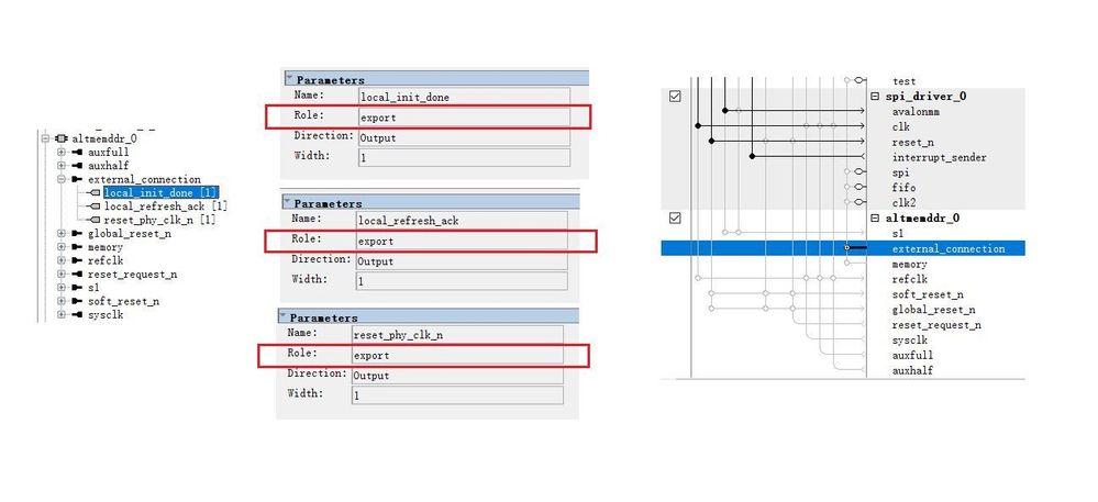 In the platform designer, the ip of altmemddr for ddr2, the signal type of external_connections (local_init_done, reset_phy_clk_n) shares the same name is export, it raises error if this conduits connected to other modules. Is it a bug of this ip? how to handle it?